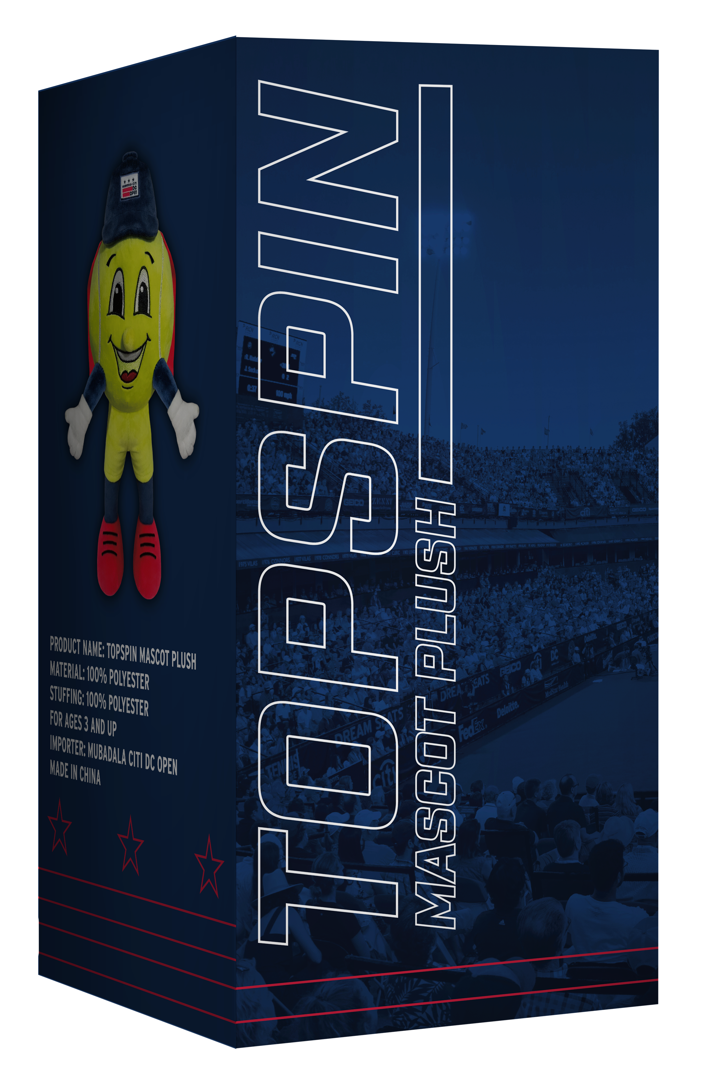 To make this plush truly special, I designed a custom product box that enhances its collectability and display appeal. The box is adorned with tournament branding and features imagery of the stadium, creating the illusion that Topspin is on center court, right in the heart of the action. As a nod to Washington, D.C., I included a modern lined flag design that wraps around the bottom of the box, and a brief history blurb about our beloved mascot on the side.